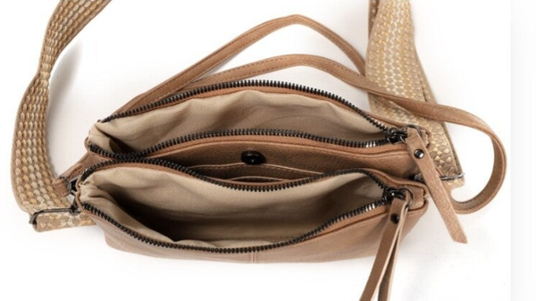 Naast de brede schouderband, zit er ook een tweede dunne effen schouderband bij de tas. Deze is gemakkelijk te verwisselen.