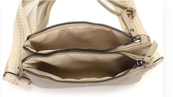 Naast de brede schouderband, zit er ook een tweede dunne effen schouderband bij de tas. Deze is gemakkelijk te verwisselen.