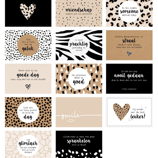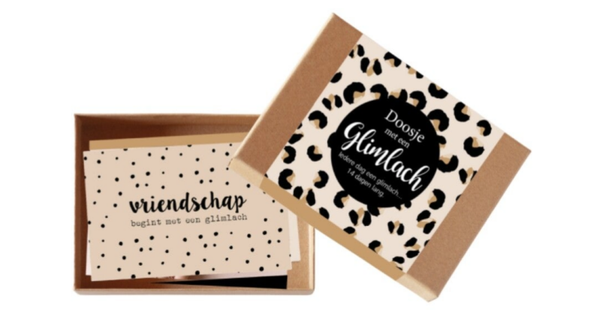 Positieve woorden geven positieve gedachten, positieve energie, een blij gevoel. Een paar mooie woorden zijn soms al genoeg om een groots gevoel te krijgen. Een glimlach op je gezicht te toveren. Daarom dit doosje, een 'Doosje met een Glimlach'. Een mooi bewaardoosje met 14 'goed gevoel' kaartjes. 14 mooie kaartjes om twee weken lang, iedere dag te beginnen met een positieve start. Be happy!