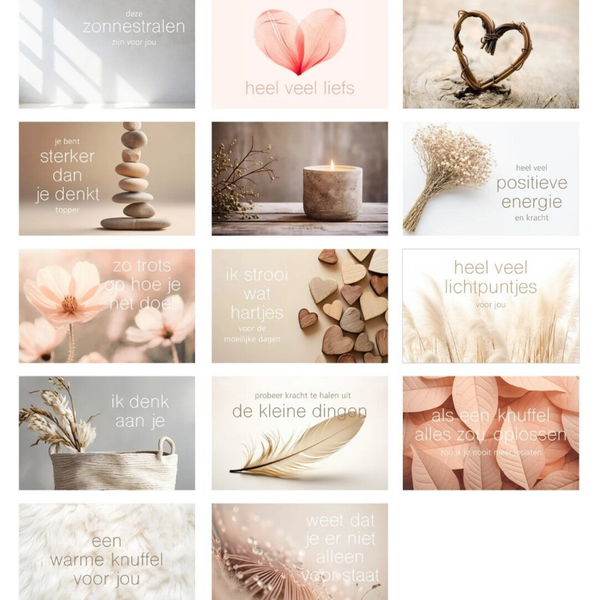 Positieve woorden omringd met prachtige afbeeldingen geven steun en kracht op momenten dat je ze nodig hebt. Een mooi bewaardoosje met 14 lieve, bemoedigende kaartjes. Kaartjes met teksten om je 14 dagen lang te doen beseffen dat je er niet alleen voor staat.
