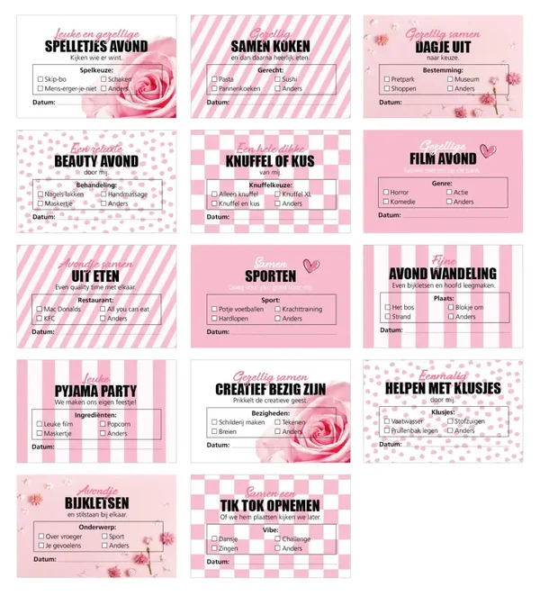 Samen leuke herinneringen maken. In een tijd van hollen, rennen en vliegen staan we minder vaak stil bij de dingen die er echt toe doen; tijd maken voor elkaar. In dit doosje zitten 14 kaartjes met een tegoed voor een zelf te kiezen moment. Denk aan een filmavondje of gezellig dagje uit. De mooiste, leukste en liefste herinneringen maak je tenslotte samen.